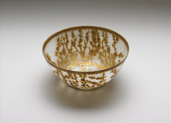 略帶小灰點的青白玉,琢一圓碗。圈足。內外碗壁都用金泥繪飾不規則的成束花葉紋,可能金泥下還塗有透明膠,因年久而變色。本器為印度作品。