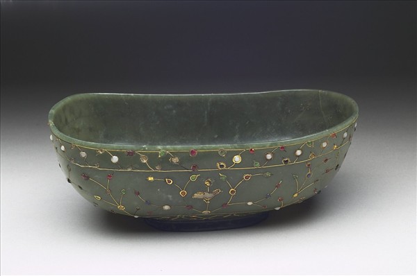 深碧綠玉。琢作一橢圓形大碗,口沿中段微凹。外壁及器底滿嵌扭絲紋金絲,以及用金圈圍繞紅、綠、藍、黃、白等各色玻璃,構成的圖案化花葉紋,還有一小鳥立於枝上。內壁在二窄端器底各挖有一個與二個彎月形凹槽。有學者認為此為印度人祭祀月神的玉器。但可能不是伊斯蘭教信徒所用。本器為印度作品。