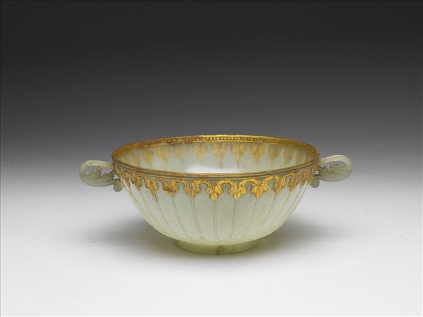 淺豆綠色玉,所雕的雙柄碗尺寸較小,圈足,足圈內的圓形器表上淺浮雕圍繞葉紋的盛開花朵,相當僵硬。口沿及腹壁最下方各琢一周莨苕葉紋,又連以垂直弦紋,口沿內用金彩繪細條裝飾帶,口沿外莨苕葉紋上也繪金彩,但已多處剝落。兩側並無從腹壁下方向上伸展的莨苕葉,但自口沿外側伸出捲葉形的雙柄。本器為印度作品。