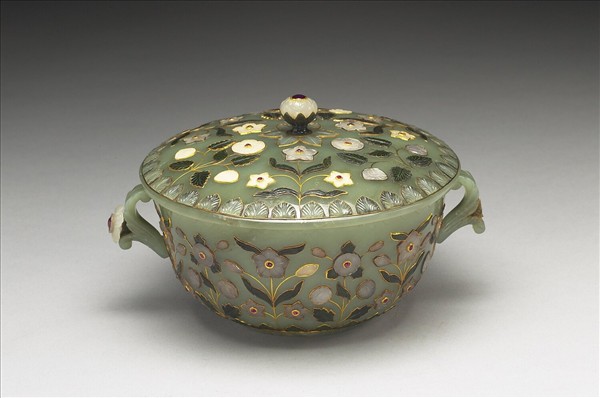 豆綠色玉,琢一深腹蓋碗,碗身比例與常見的蒙兀兒玉碗不同,但器底淺浮雕平展的八瓣花,琢工近似蒙兀兒玉雕風格。蓋鈕琢成花蕾形,蓋面與腹壁上,用白玉、碧玉、金屬絲、紅寶石等,嵌飾花葉紋,印度中南部的沙拉金博物館中,展出類似風格的玉器。此器最特殊之處為雙柄自腹壁中段向斜上方立雕一捲葉,葉內綻放盛開的小花。與典型的蒙兀兒雙柄碗自腹壁下緣貼著器壁淺浮雕莨苕長葉至口沿,再垂下花苞的作法完全不同。本器為印度作品,可能是18世紀晚期,為了銷售至中國的新款式。此碗貢入清廷後,很受乾隆皇帝的珍愛,命玉工在碗心及蓋內分別刻上「乾隆御用」及「子孫永寶」。
