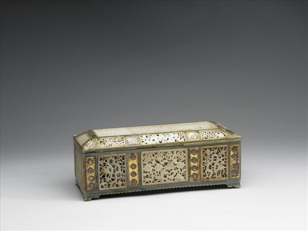 長方匣以多片青綠玉與明代白玉帶版組合而成,平底,帶四足,梯形蓋。玉帶版鏤雕龍紋、鳥禽、花葉紋,有些更鏤雕一組組吉祥語。蓋頂以兩片玉帶版拼接。右邊玉片上鏤雕的字,自右至左輪替向中央讀為:「風調雨順萬萬壽」、左方一片鏤雕「萬方如意」;盒身四面中央玉片分別鏤雕「四夷來賀」、「八方寧靜」、「吉祥如意」、「永世長春」等字。除了帶版外,匣與蓋身各面嵌多塊玻璃,玻璃下方裝飾金屬製花朵。匣內一端分作三格,上面分別加裝圓形玉蓋,或可用來盛貯墨水。附珊瑚水勺一支。據《活計檔》推斷,本器入宮時最初被稱為「痕都斯坦墨壺筆室」,乾隆五十七年(1792)皇帝又回想起往事,因而另作器底所見之御製詩〈詠賽提卜阿勒第所貢和闐玉筆硯匣〉:「巧琢和闐玉,四藏宛具中。雖非貴異物,實乃表丹衷。鎸字頗相似,非書却不通。鑒誠與笑納,亦以暢文風。乾隆壬子春御題。(下接二鈐印)八徵耄念。自彊不息。」本器為中亞作品。
