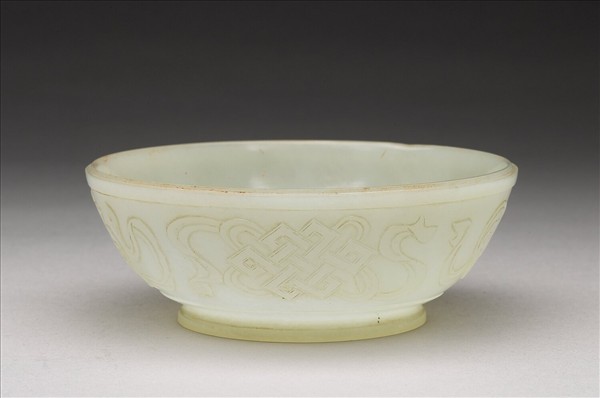 ⽟質。圓⼝,深壁,圈⾜。腹外壁飾八寶紋。