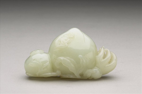 青白玉質。雕兩顆桃實與佛手相連,上琢展翅蝙蝠,下連波狀枝葉。取「福壽雙全」之吉祥意味。