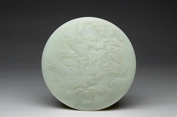 青白玉質,圓插屏。雙面巧雕松林山石構成的山水奇景。畫面中景斜向往後延伸的空間中,一面刻樓閣與高士、童子,另面刻雙鹿。