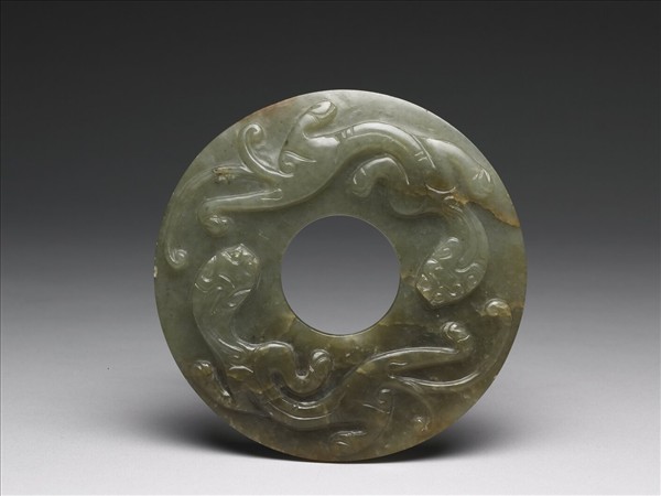 碧玉質,局部受沁為褐色,有璺。一面高浮雕身形扭動、上下相對雙螭,另面滿飾雲紋。