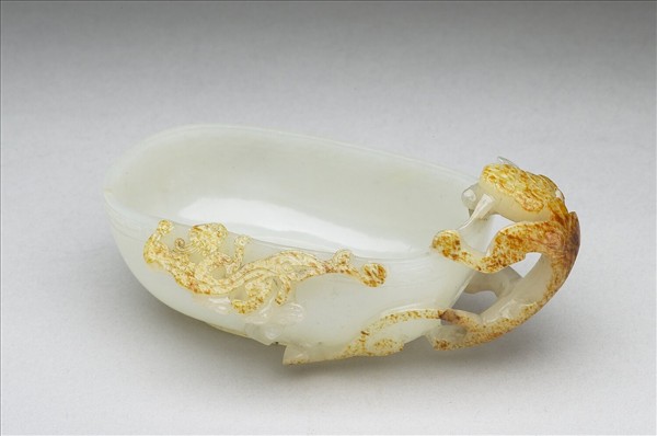 器身作橢圓形,侈口,矮壁,淺圈足。浮雕一螭形耳,口銜靈芝;口沿亦浮雕蟠螭,下襯流雲。器壁光素。玉質晶瑩,螭身利用玉皮為之。