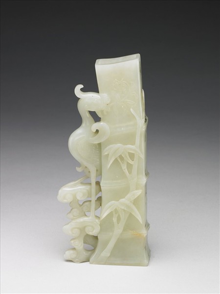 青玉質。全器作四節竹枝長筒形花插,器身飾竹枝竹葉呼應。側身探出回首鳳鳥,挺立於湖石之上。「鳴鳳在竹」取君王仁德賢治的象徵。