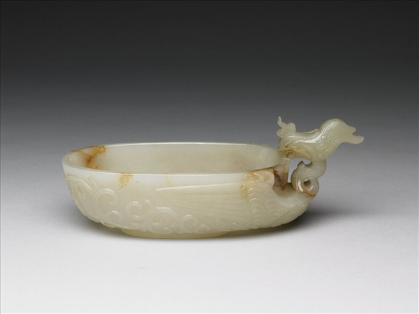 青白玉質,局部受沁褐色。全器作橢圓形洗,側立雕鳳首鋬,以喙、爪緊扣口沿,長鬣翻飛,線條流暢,具律動感。頸部呈圓弧彎曲,開展的雙翅裹抱器身兩側,如卷雲似的尾羽蜿蜒於器外壁。