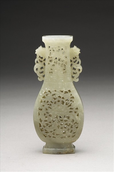 玉質,局部受沁白化。扁瓶,長頸,斜肩,弧腹,圈足。器表鏤雕纏枝花卉紋。
