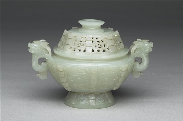 青白玉質。侈口,深腹,圈足,腹側飾獸首耳,附鈕蓋。蓋、腹對稱以高浮雕裝飾扉棱。腹、足飾淺浮雕獸面紋。器蓋鏤雕夔紋,鏤孔可供薰香的煙氣飄散。此器用作香爐,與瓶、盒三件一組,同為焚香之成套器具。
