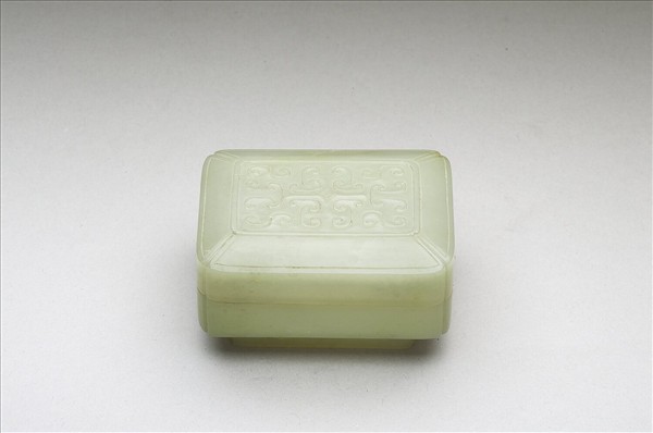 玉質。方形盒,蓋與器身略等。平蓋、直壁、圈足。蓋面飾雲紋。