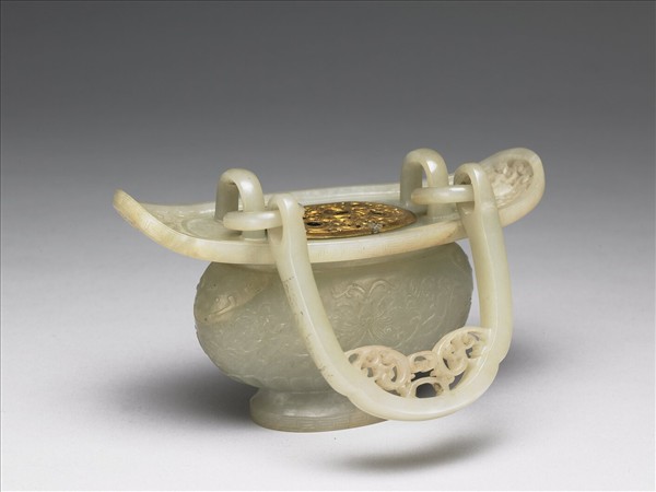 玉雕活環長柄花藍,敞開口緣兩側雕雙夔龍與團壽紋,器壁兩側淺雕獸面紋,器身則以番蓮紋環繞。內有五孔鎏金銅膽,足見此花籃被做為花器使用。