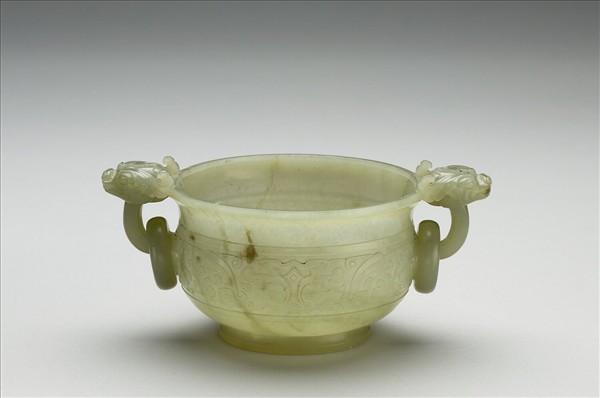 玉質,帶褐色斑及瑕紋。仿青銅簋造型。圓口,碩腹,圈足,雙耳,矮圈足。耳作鏤雕龍首狀,下接活環,器腹琢飾簡化獸面紋。