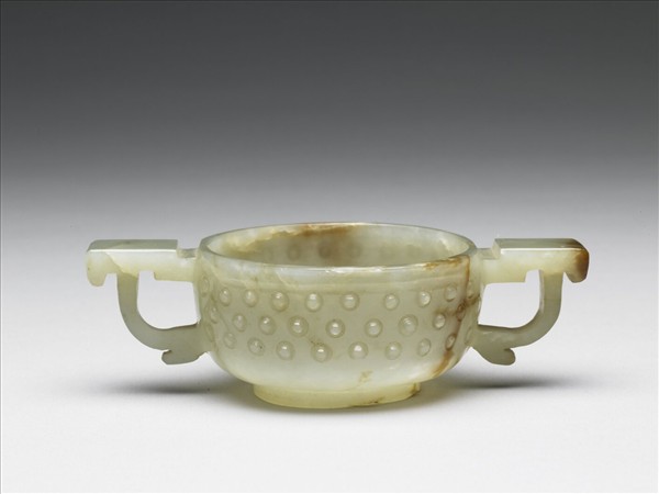 玉質,帶淺褐斑及瑕紋。杯形,帶鏤雕簡化龍耳。器腹雕飾乳丁紋。