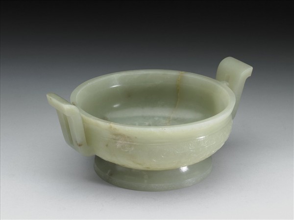 白玉,有褐黃、赭黑斑及瑕紋。盤圓口、淺腹、雙附耳,圈足。器腹飾變形獸面紋,以回紋為地,口、足沿面各飾回紋一道。盤內底一圈刻有「大生□作其鼎,子子孫孫萬年永寶用享。」