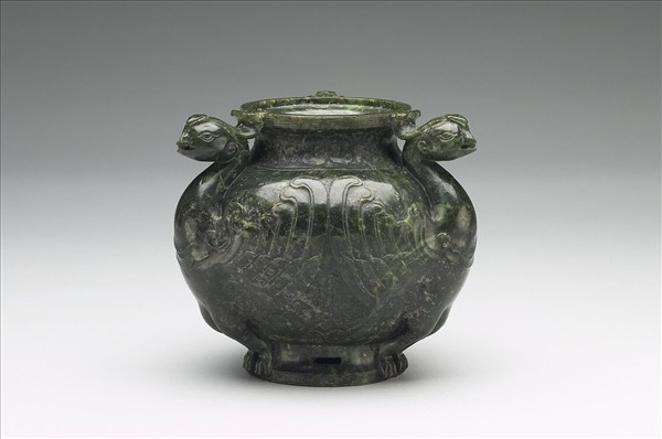 碧玉,帶灰白斑。器形仿自青銅尊形器,青銅尊一般作為盛酒器。器口寬敞,束頸,豐肩,碩腹下歛,圈足。口沿及足沿各飾回紋一道,器身浮雕鳳鳥紋三隻,展翅站立,雙翅延展至器面,設計工巧,線條簡約。器底刻「乾隆年製」四字篆款。