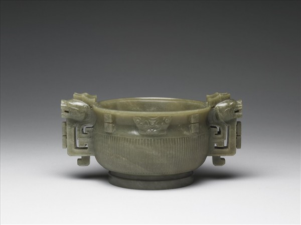 玉質,帶灰白瑕紋。造形仿青銅簋形,折沿,束頸,弧腹,雙耳,圈足。器腹琢直稜紋,頸浮雕二獸面紋及出戟棱脊紋四道;雙耳作鏤雕夔龍,龍身曲折,可作把手。