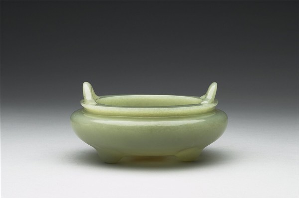 青玉,略帶灰白及褐斑。折沿,束頸,淺腹,雙立耳,三乳足。全器光素無紋。