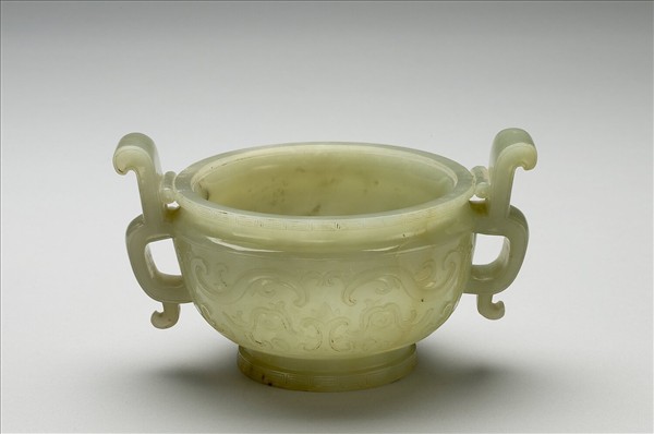 玉質,帶褐色及黑褐斑紋及瑕紋。折沿口,束頸,弧腹,雙耳,圈足。器腹刻飾獸面紋,口沿、圈足折沿面上各飾回紋一道;器耳下部為商周傳統的帶珥附耳,上部結合明代流行的朝冠耳。