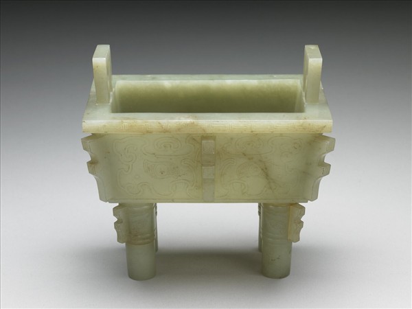 玉質,帶灰白、黃褐色斑紋及瑕紋。仿青銅方鼎造型,體作長方形,折沿口,雙立耳,直腹,平底,四足。器腹和足都有出戟棱脊,腹雕飾獸面紋,四足亦刻簡略獸面紋飾。口沿、耳及棱脊面均飾回紋。