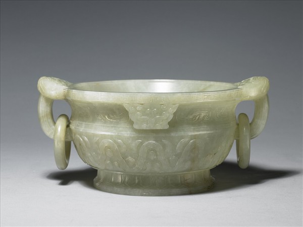 玉質,帶灰白及褐黃斑。折沿口,束頸,弧腹,高圈足,雙耳,下接活環。器腹琢波曲紋,器頸浮雕兩獸面紋及雲紋,足飾蓮瓣紋,雙耳各立雕螭龍紋。