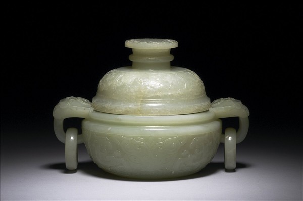 玉質,有灰白斑及瑕紋。爐帶蓋,折沿,碩腹,雙獸耳,帶活環。器腹琢獸面紋,以回紋為地;器蓋圓拱上淺琢夔龍紋,蓋沿一圈飾回紋,鈕中空,上刻蓮瓣紋。