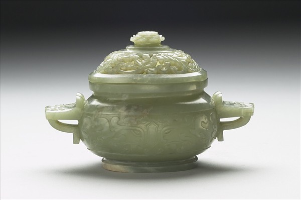 玉質,有灰白及褐黃斑。爐帶蓋,折沿口,束頸,弧腹,雙獸耳,圈足。器身琢飾獸面紋,器蓋折沿,蓋面鏤雕番蓮紋,蓋鈕作一盛開的蓮花,蓮蓬裡的蓮子粒粒可見。鏤空蓋面,焚香時可使香氣薰出。
