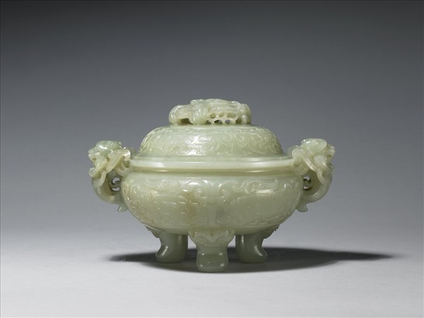 玉質,略帶褐黃斑,質潤有光澤。圓形爐,帶蓋,雙龍耳,三獸足。器腹飾獸面紋,兩側雕龍首作耳,齜牙咧嘴。蓋面琢飾螭龍紋,頂鏤雕一正面盤龍,龍鬚外張,精神抖擻,龍身捲曲一圈,正好作為爐蓋的鈕。