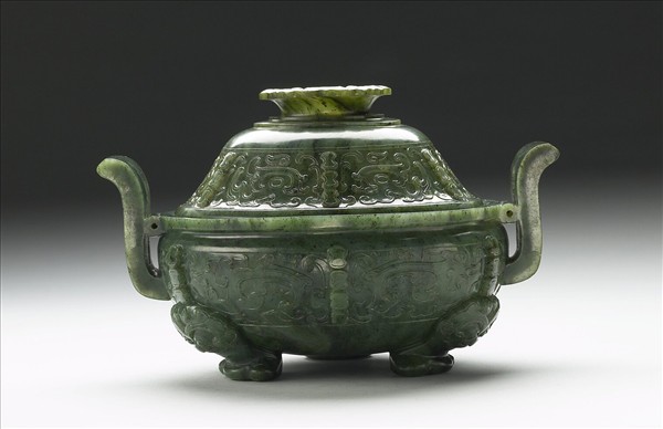 玉質,帶灰白黑色點斑。爐帶蓋,折沿,雙朝冠式耳,三獸足。器腹、蓋皆雕飾獸面紋和棱脊,蓋圓拱,鈕中空,呈盛開蓮瓣形。