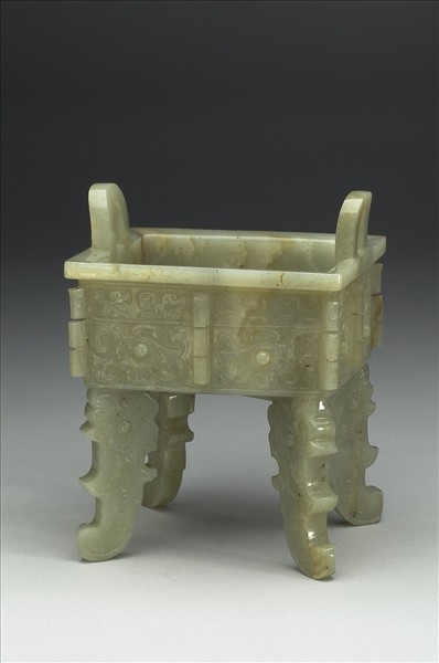 器型仿三代銅方鼎,是當時仿作許多的「文王方鼎式」之一例,器體長方形,有扉棱,四足作側身卷尾龍形。器身上層淺平浮雕側身螭紋,主體淺平浮雕獸面紋,回紋地。據玉質、表面光澤,似接近乾隆時期的取料、拋光風格,惟雕工較粗糙。