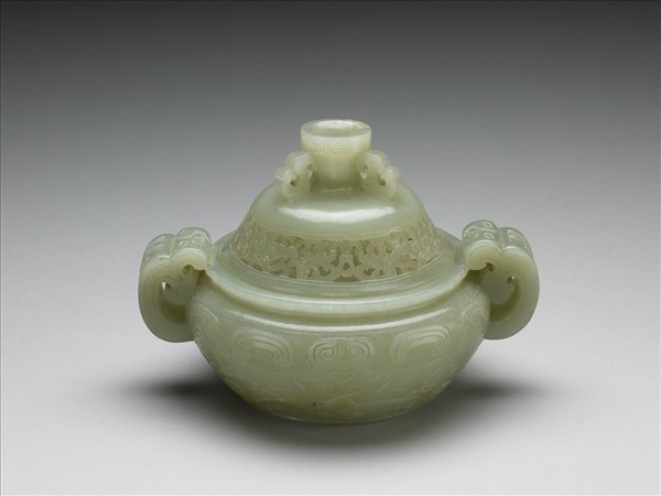 玉質,略帶灰白斑。圓形爐,折沿口,雙耳寬厚,蓋作碗形,鈕高,鈕與蓋面另飾鏤雕螭紋。器腹琢飾變形獸面紋,以回紋為地;器蓋圓拱,鏤雕纏枝卷草枝葉紋,蓋鈕中空,沿邊飾回紋一道。