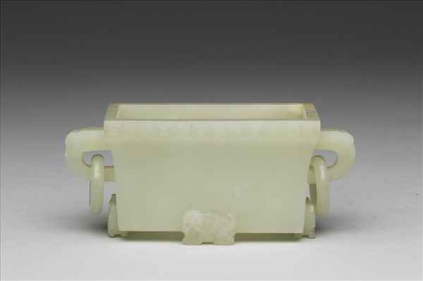 玉質,有瑕,帶褐黃斑。長方形洗,作盛水之用。器兩側鏤雕龍形耳,下接活環;四面底部各有一獸足,雕作仰面狀,具裝飾性,口沿一圈回紋。