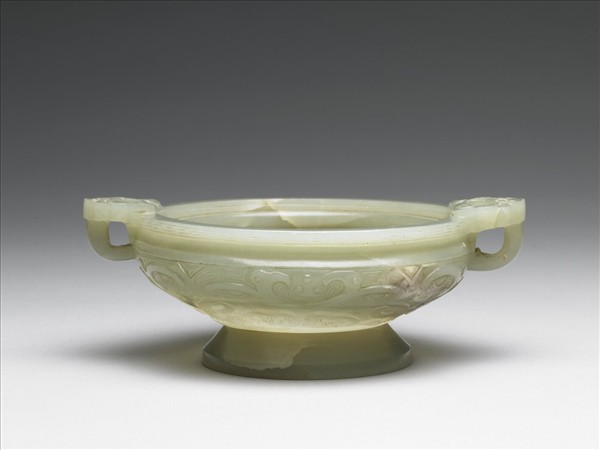 玉質,帶灰白、赭褐斑及瑕紋數道。器琢呈淺壁圓洗狀,折沿,束頸,雙耳,撇足。器腹兩面各琢飾一對交纏相對的鳥紋及獸面紋,以回紋為地;口沿飾回紋一道,雙耳則雕飾面孔朝上的獸面紋。