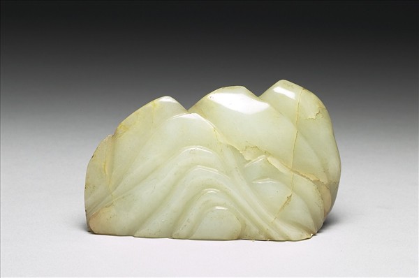 玉質,色青白。山形玉座,身淺浮雕山巒起伏線條,山峰交疊之凹處可以擱筆。