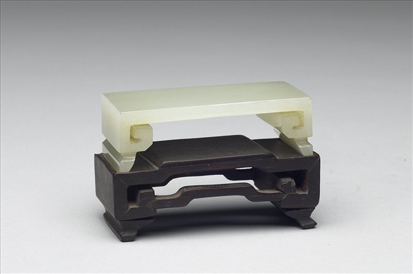 作小方几式,足內卷,下承梯形足座,全器光素無紋,附一相同形制木座。墨床為擱墨用的小案架,為文房用具之一。