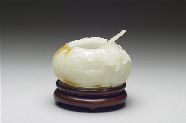 玉質,色白微有黃斑,質地細潤。扁圓形水器,平口,圓腹,圓底。器腹淺浮雕連枝瓜果,並雕滿藤蔓與葉,造型蜿蜒流利。有小玉勺與木座。