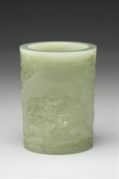 玉質,有瑕及褐黃斑。筒形,凹足。筒壁雕琢山岩樓閣庭園,園有流泉、松樹,樹下兩童手捧書冊。