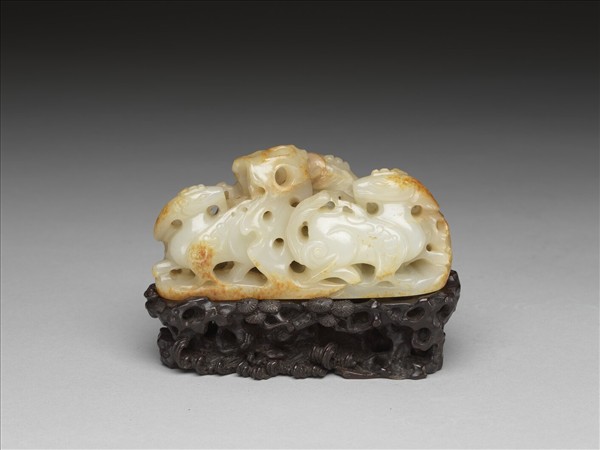 文人桌案的各種文房用具,隨著時代演進,不僅實用,同時也必須兼俱美觀,甚至其實用功能,更轉化成雅致的陳設品。在《長物志》之〈器具〉卷中,可看到〈筆格〉,樣貌起伏如山,但材質各有不同,此件玉雕筆格,雕辟邪遊憩於山石間,以鑽孔鏤雕,雕三隻神獸與奇石,巧妙形成「山」字形,可做為筆格。