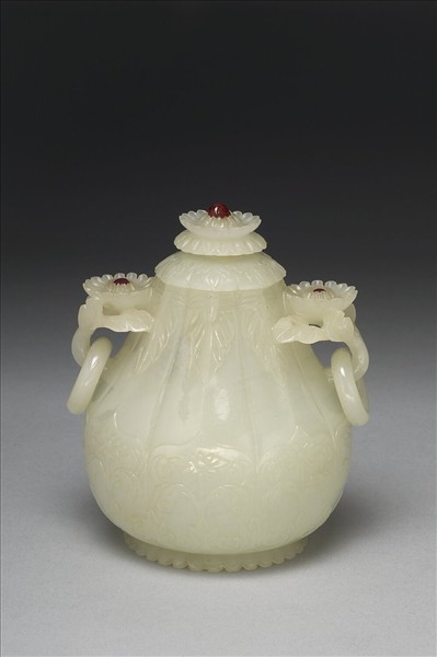 玉質,琢一小蓋罐。器身琢成八稜,腹壁上、下緣各雕一周莨苕葉。蓋鈕及雙柄各雕一盛開的小菊花,花心處嵌紅寶石一粒。雙柄垂活環。器底雕一平展的菊花,四層密集的菊瓣,花心處嵌一粒紅寶石。