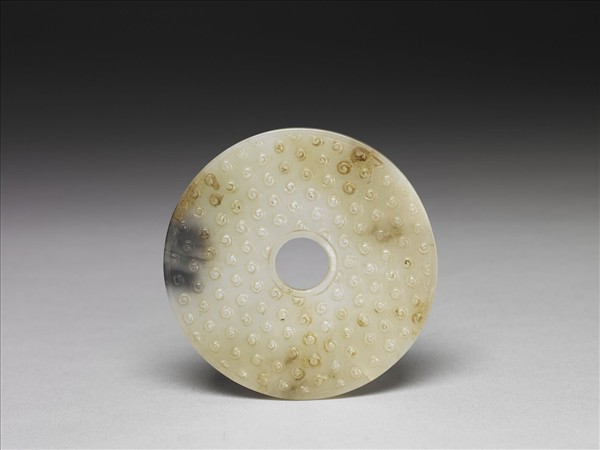 玉質,小片黑色斑,有廓,中孔徑小。器面上浮雕穀紋。這件玉器上的穀紋,樣子就像標點符號中的逗點,也就是形如一個小圓點加一小尾巴,可能是用以象徵、模擬稻子的發芽狀態。原為木盒上之嵌件,該木盒儲玉器與書法冊頁各一。