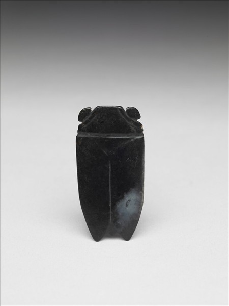 玉質,黑色,整器作一蟬形,頭部雕圓眼,一面淺浮雕蟬翼。另一面大致平坦,僅在上方刻兩現交叉,下方磨凹痕兩道,以區分出蟬身與蟬翼。本件作品表面使用簡單的數道陰線來表現玉蟬頭翅的作法,確與漢代玉蟬表現頭翅的作法類似,但是其蟬頭下有一道特別粗且深的陰刻橫線,又和典型的漢代玉蟬不類。因此,本器或可能是後代模仿漢玉蟬的作品。