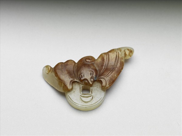 玉質,略成三角形,上有大片赭斑,工匠巧妙利用赭斑顏色,將赭部份分雕作成蝙蝠,白色部分則琢成一「天下太平」錢,寓意「福在眼前」。