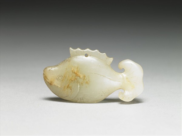 玉質,整器雕為一魚,背鰭與魚身交接處有穿。魚身線條圓潤外張,背鰭作鋸齒狀。尾鰭開展,邊廓曲線柔潤。