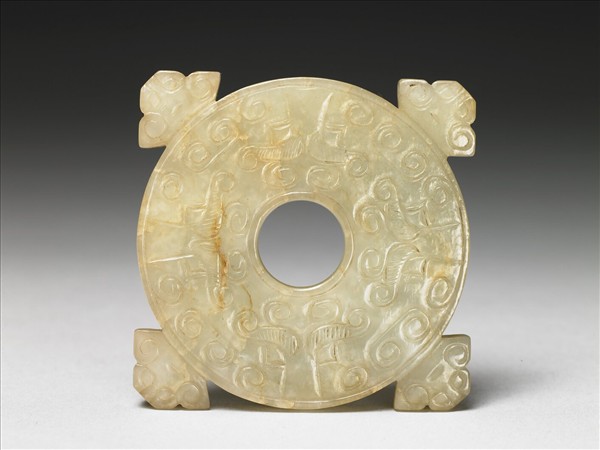 玉質,微有赭斑,整器如「四圭有氐」之式,亦即玉璧疊覆於四圭上,四圭尖首露出玉壁四郊之形。玉壁面刻圖案化獸面紋、如意雲紋,四出之圭首則刻為螭首之貌。