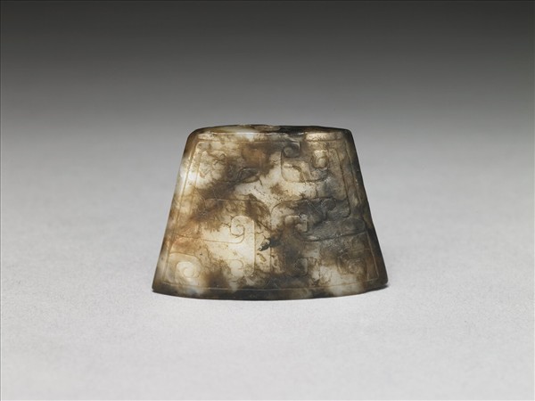 玉劍飾,摻雜大片赭斑,呈現白色的部分較少。器呈梯形,原為安裝於劍鞘底端的飾品,一般稱為劍珌。梯形面上作減地雲紋。上底面有一圓形凹痕,下底面陰刻雲紋為飾。