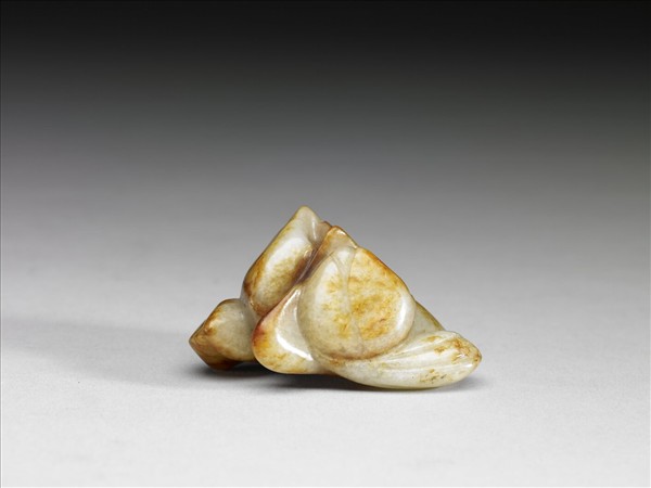 玉質,間雜赭斑,雕二花並立相連,但花含苞未放,花底延伸出二葉,器底部鑽一個圓孔,這個圓孔直接穿透整件器物,一般簡稱這種通透全器的鑽孔施作為「通心穿」,這種通心穿的作用,也許是可讓絲繩一類的物品穿過,使本器可以佩帶,或是綁緊固定在其他器物之上。
