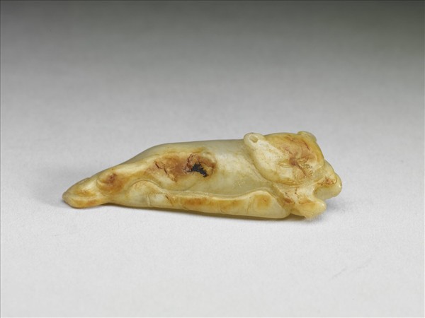玉質,雜赭斑。雕作一貓趴臥於葉上,前足趴伏葉緣,整隻貓趴在葉上的姿勢,貓身拉長,似乎表現了這隻貓的慵懶之狀。至於貓趴伏的長葉片,則以陰線表現葉脈,葉梗彎曲成穿。