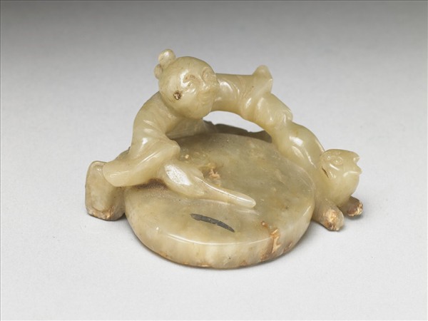 玉質,雕一人坐踞圓案前,昂首笑顏,雙臂弧拱為圓,衣袖隨手臂弧拱的動勢而向外側飄揚。玉人右手持短棍狀物,似正擊打圓案,圓案或即是表現鼓面。圓案側邊又雕刻著一隻貓,前腳趴伏,身體拱起,回首瞪視。