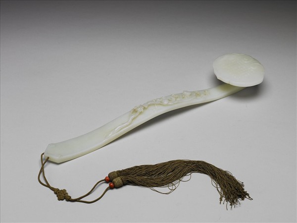 玉質,如意柄面上浮雕一折枝花卉,柄背面與如意頭部面上分別刻有清高宗御製詩文,詩與文所言皆指向同一件事-亦即清高宗認為民間玉匠製作玉器時,有品味俗氣與貪求高價的毛病,而本件玉如意亦存在這樣的狀況,因此,清高宗指示臣下對此件玉器加以琢磨改作,去掉了乾隆皇帝認為俗氣的部份,這正是乾隆皇帝改作當代所刻玉器的實物例證。