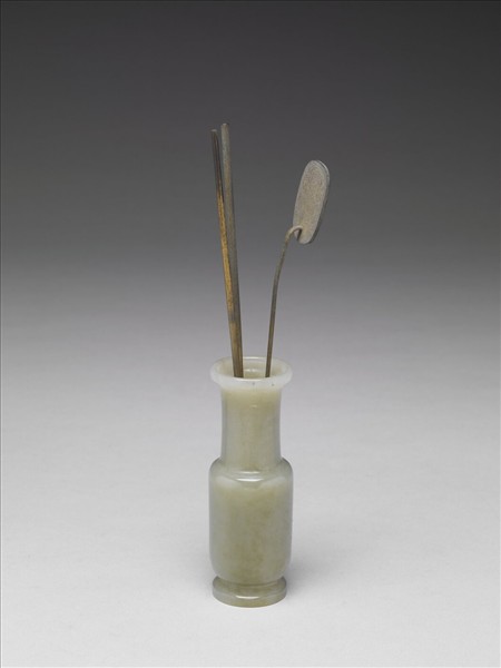 直口下緣略收,直頸,圓肩,直腹下緣略收,圈足。玉質,沁有褐色斑,平素無紋。附銅箸一雙,銅鏟一只。